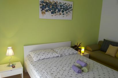 Apartman se nalazi na trećem katu sa balkonom i prekrasnim pogledom na cijeli trogirski zaljev, površine 50 m2, prostran je i dobro opremljen: